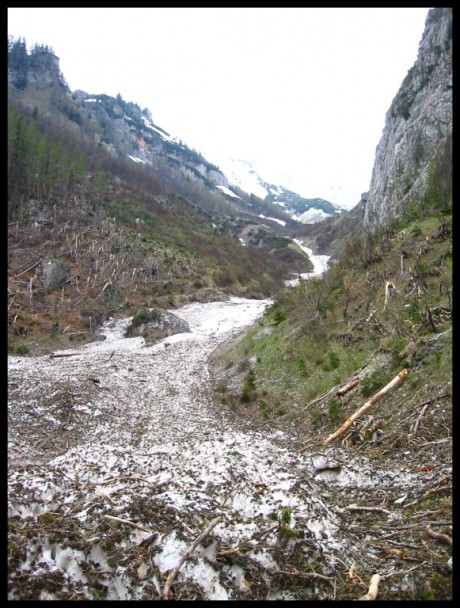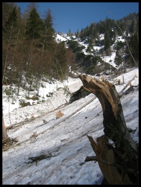 V květnu spodní úsek,takhle vyčesala stromy ohromná více než kilometrová lavina