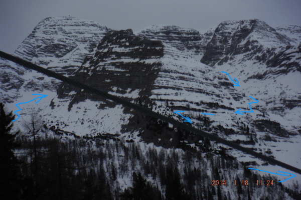 Posouzení risk lavinového traverzu z údolí před akcí. Bez chlupatých pásu se nelze případně dostat zpět do sedla.