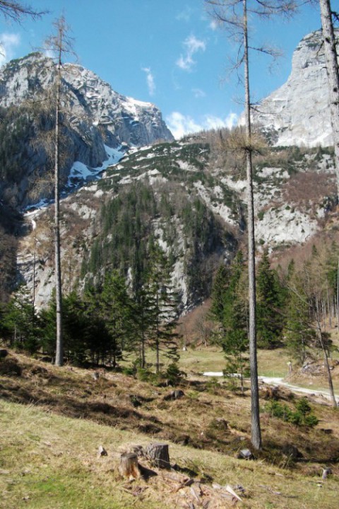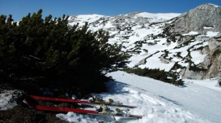 Napadlo nejmíň sněhu za posledních 10-15 let a projevilo se to hned už druhém dubnovém týdnu, kdy sitřuace vypadala jako o měsíc později jiných sezon.Severní konec zcela sevřeného Stodertalského údolí Totes Gebirge věstil nějaký ten sníh, tak jsem vyrazil. Polední výstup od parkoviště Baumschlagerreith v 750m až po první sníh v 1500m byl s lyžákama na ruksaku a plnou ski-polní dost utrpení.